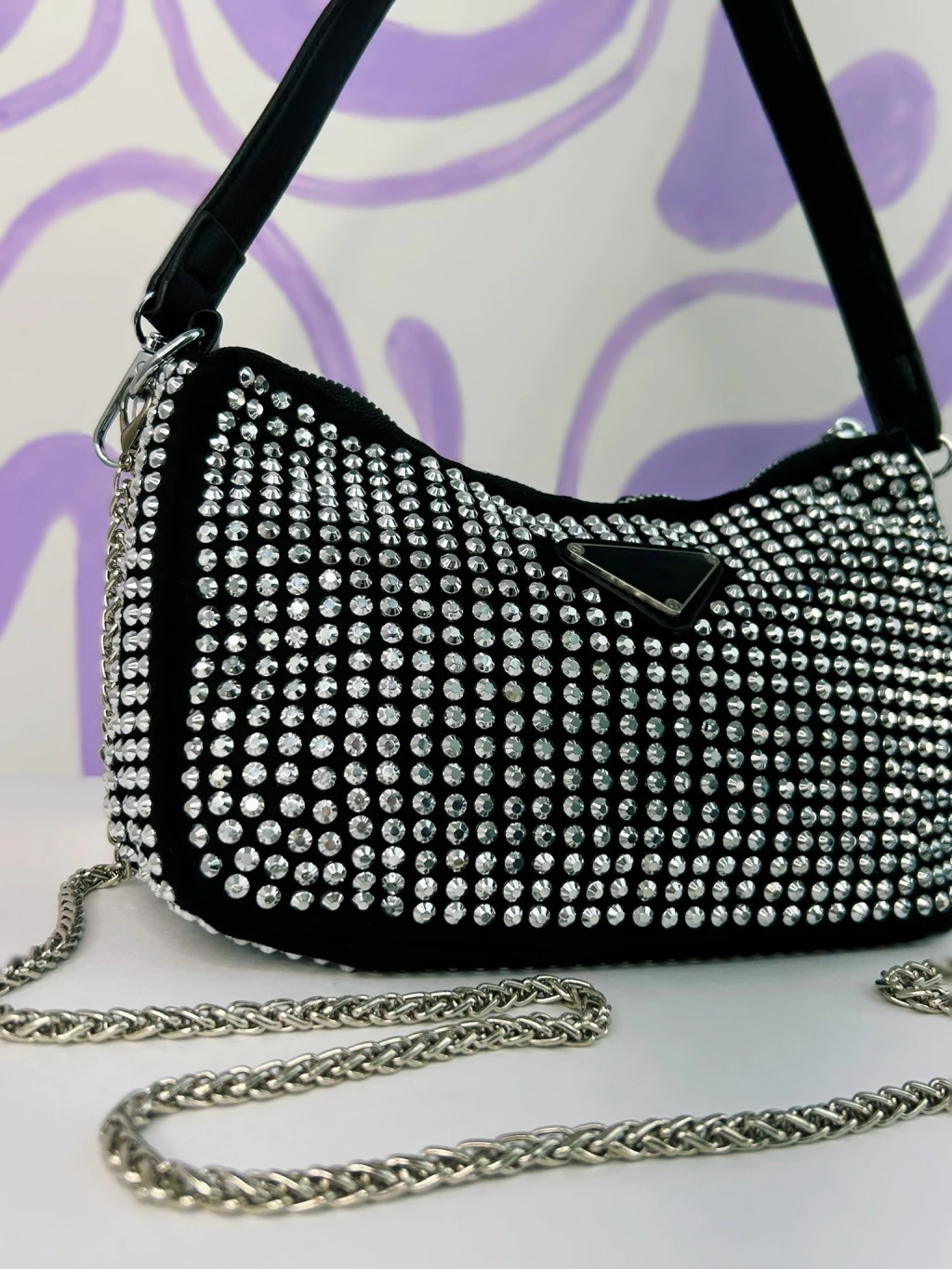 Destaques: - Duas alças: uma de corrente para um toque moderno e outra sintética para conforto - Design compacto com acabamento em strass prata, garantindo brilho e charme - Ideal para eventos, festas ou para complementar seu look do dia a dia